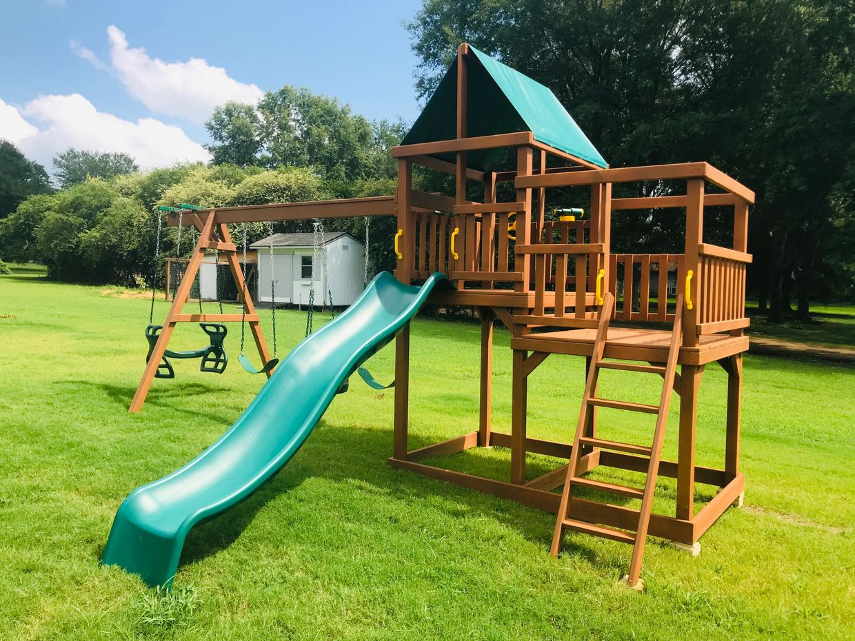 5'x8' overall size, split level with 4' to lower level and 5' to upper level. Includes ladder, 10' slide, telescope, 4 hand grips, steering wheel, vinyl roof, and sand box. Will accommodate any of the three swing attachments.